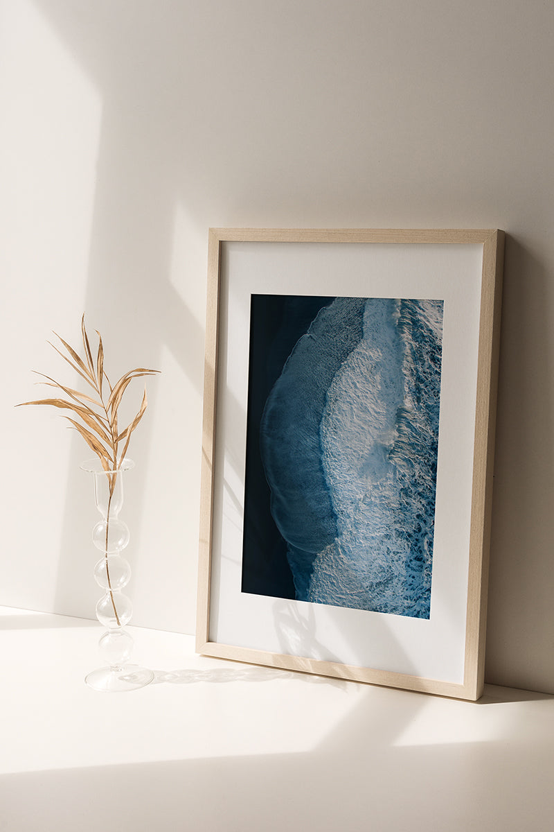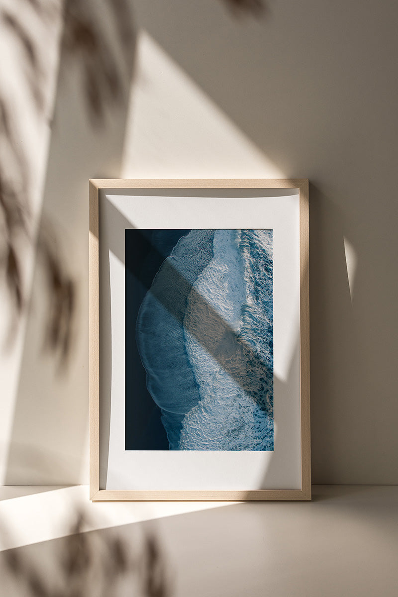 From above, an Atlantic swell carves bright foam into Reynisfjara’s obsidian shore. Motion held at the split second of impact. The aerial view turns raw power into clean geometry and rich texture, creating a high contrast statement piece for modern interiors.