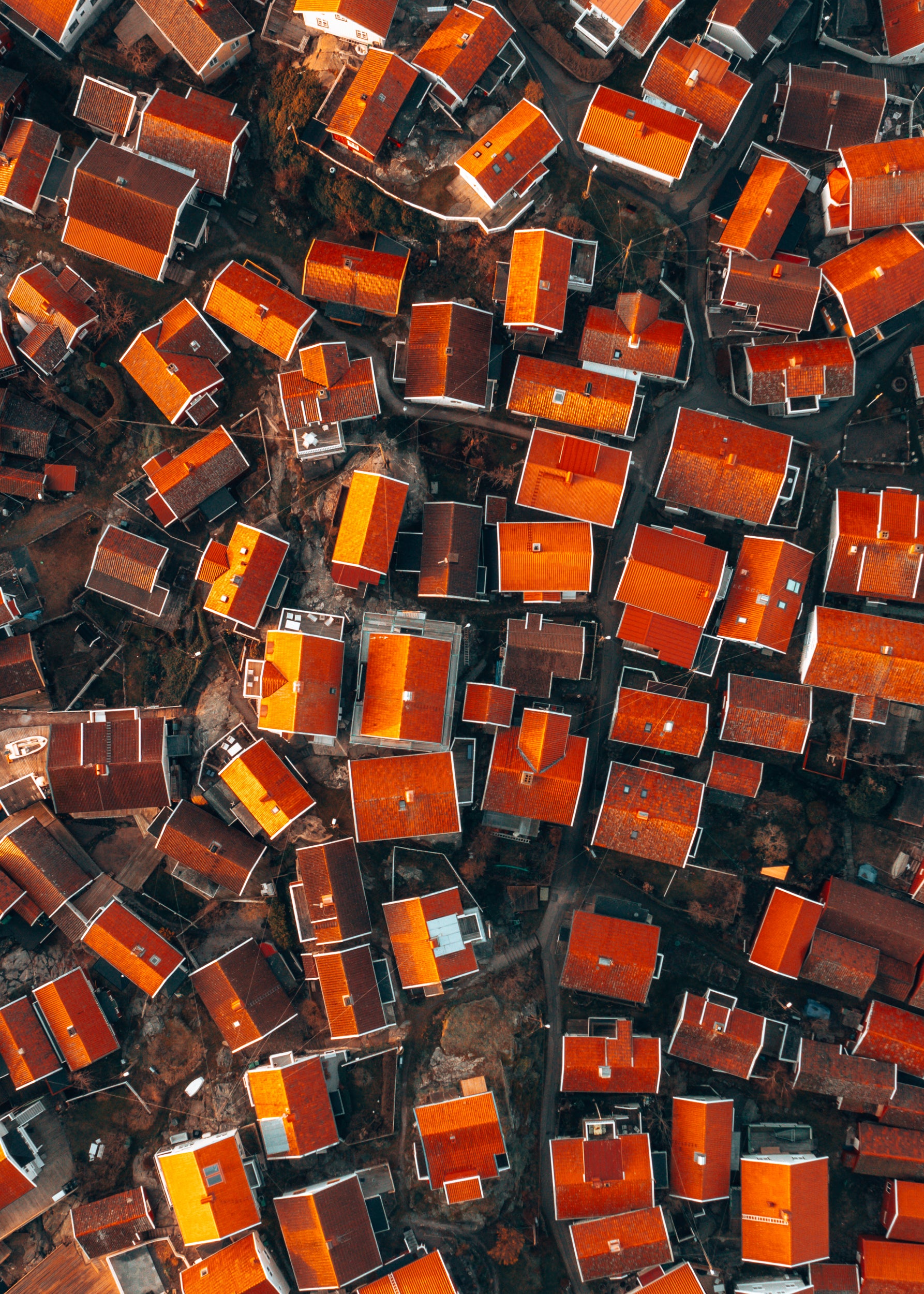 This aerial photograph captures the clustered rooftops of homes scattered across the islands of Orust, Sweden