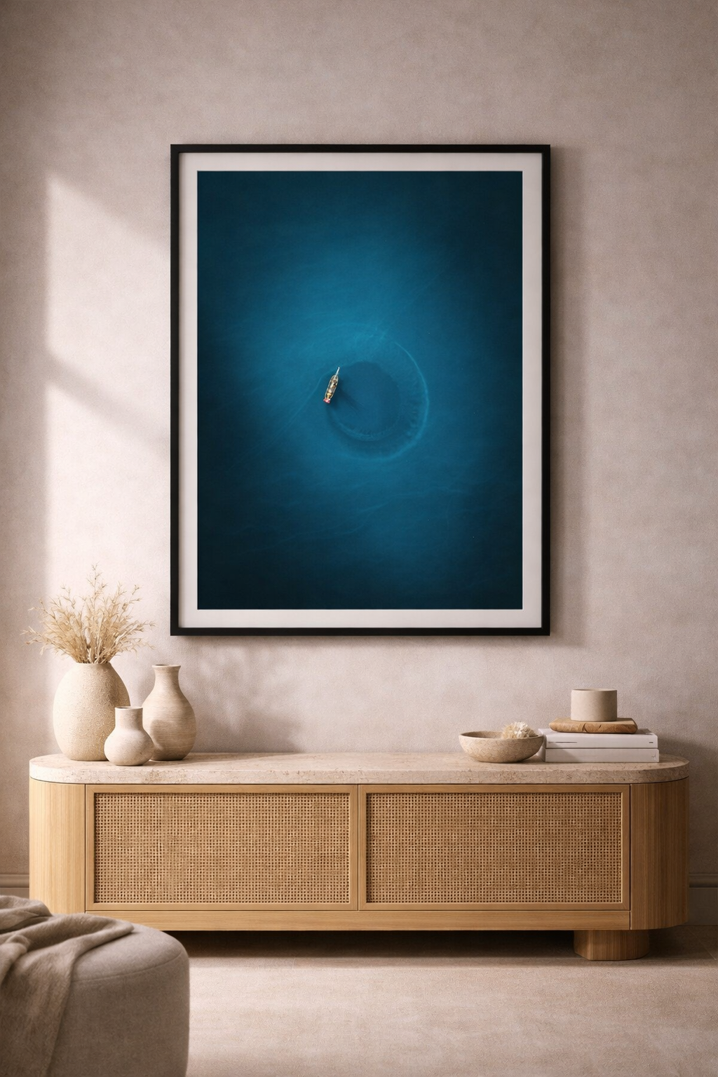 A solitary boat circles above a swirling abyss, suspended in the stillness of endless blue. Our wooden Schooner Hildur is gently navigating through the silt.